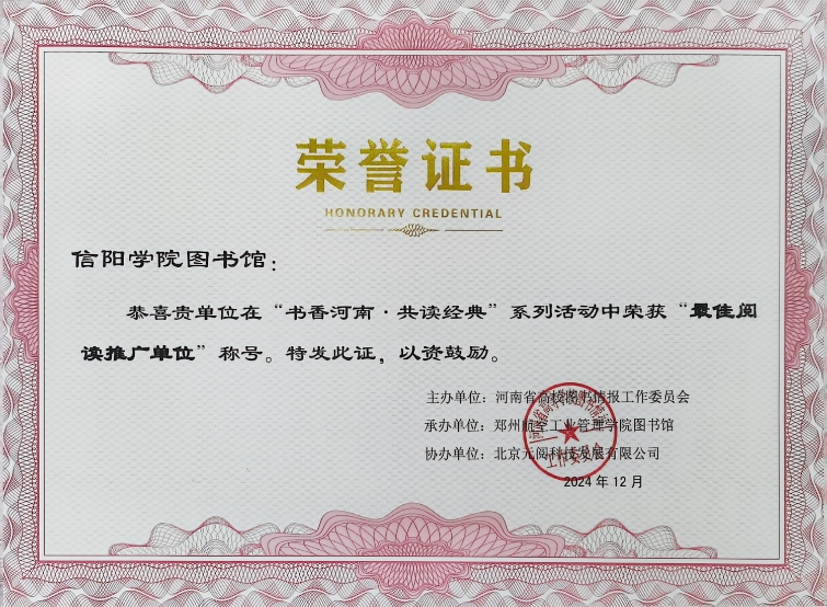 近日,由河南省高校图工委主办的全省高校“书香河南·共读经典”活动历时两个月圆满结束。在此次大赛中,图书馆积极宣传、师生踊跃参与,取得了较好的成绩。我校图书馆荣获“最佳阅读推广单位”,王思婕老师荣获“最佳阅读推广人”称号,八名同学荣获“阅读达人奖”。