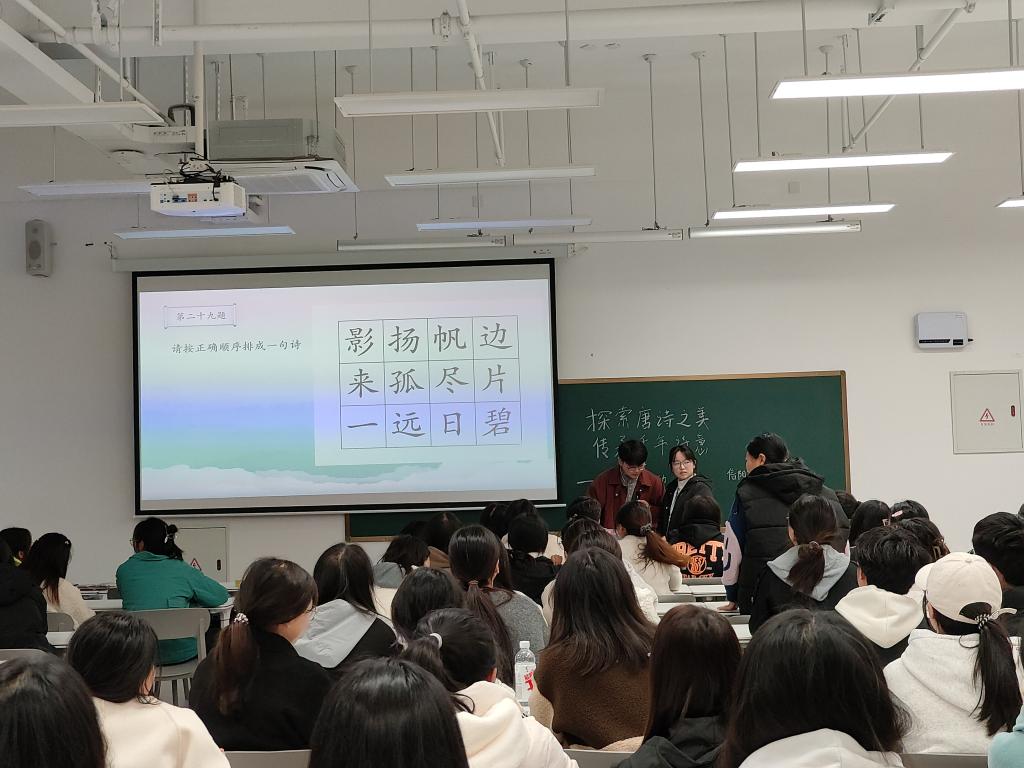 此次活动分为两个环节:“腹有诗书气自华”“电光火石见诗情”。题目有难度、有坡度,设计新颖,内容丰富。每道题目以抢答的方式答题,给参赛者们营造了紧张而又刺激的比赛氛围,各小组之间沉着冷静、配合默契答题,充分展示了他们丰富的诗词底蕴。