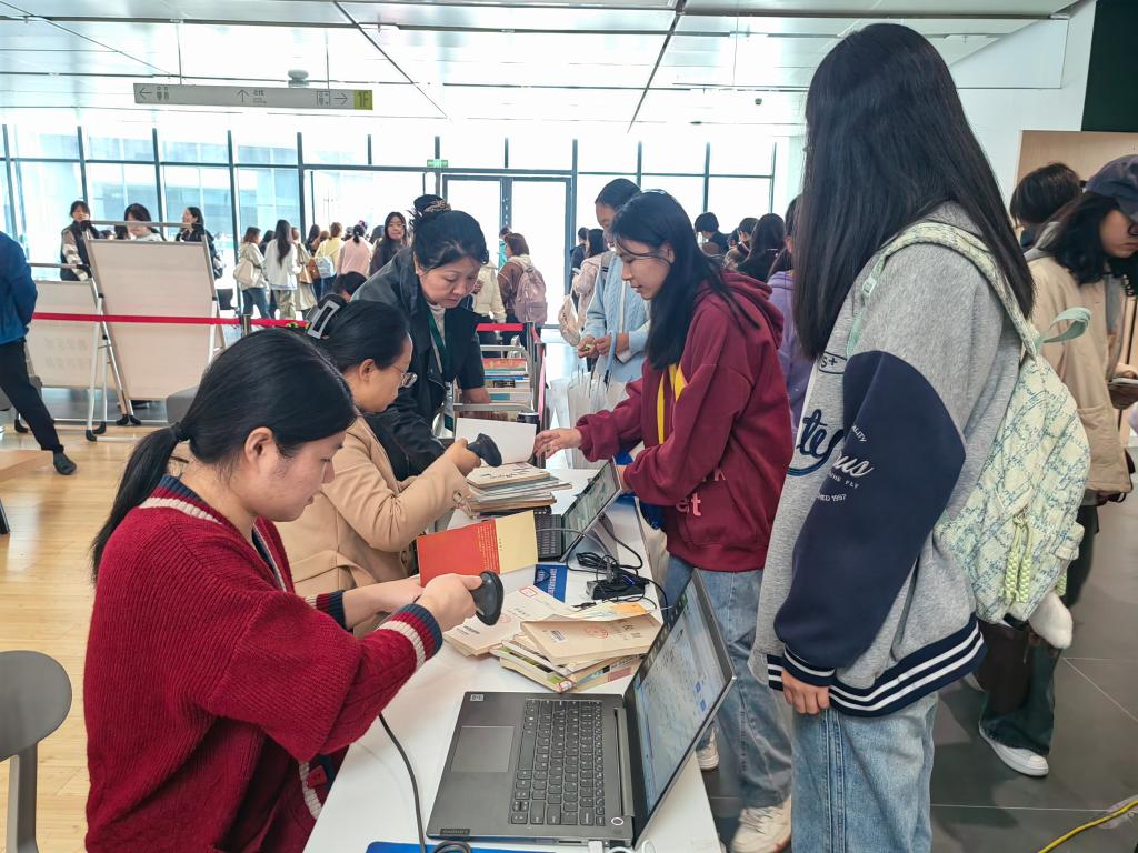 活动现场,很多学生或挑选或阅览图书,图书馆老师边维持秩序边办理借还手续,整个活动现场气氛热烈而有条不紊。