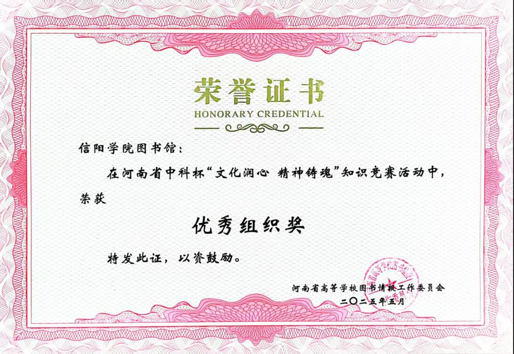 近日,由河南省教育厅高等教育处指导、河南省高校图工委主办的河南省中科杯“文化润心 精神铸魂”知识竞赛活动圆满落幕。我校在本次竞赛中取得了优异成绩,信阳学院图书馆荣获“优秀组织奖”,王思婕老师荣获“优秀组织教师”,我校学生王艺典、武梦、陈清耿、贺嘉若荣获本科院校组“优秀奖”。