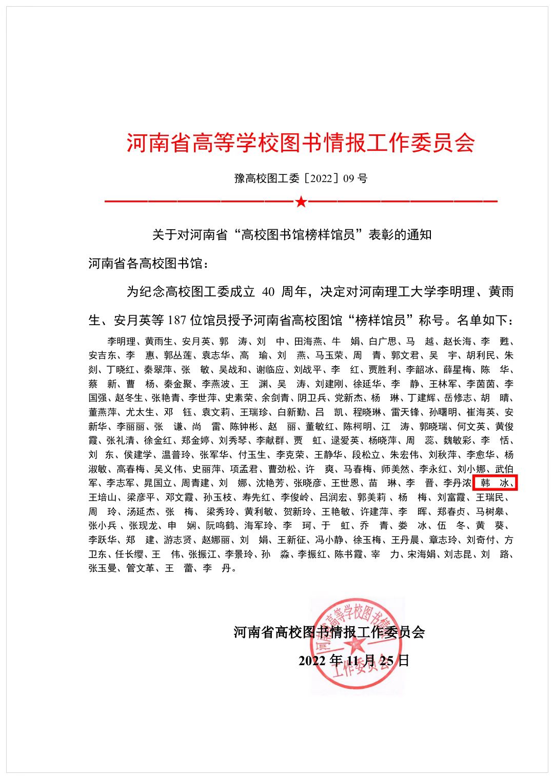 近日,我馆教职工韩冰荣获由河南省高校图书情报工作委员会颁发的“高校图书馆榜样馆员”。