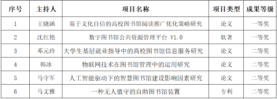 同时,我馆在河南省第十三届图书情报学术成果评奖中,共有6个项目获奖,其中一等奖2名,二等奖4名,得奖总数创历年新高。