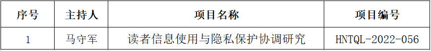 另外,在2022年度河南省图书情报研究项目立项评审中,我馆马守军同志申报的《读者信息使用与隐私保护协调研究》项目获批立项。