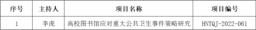 近日,河南省高等学校图书情报工作委员会公布了2021年度河南省图书情报研究项目结项审核结果,我馆李虎同志主持的《高校图书馆应对重大公共卫生事件策略研究》项目,以较高质量获准结项。