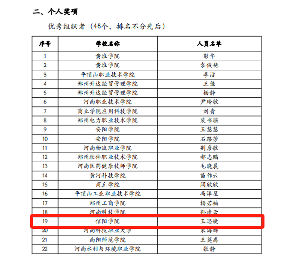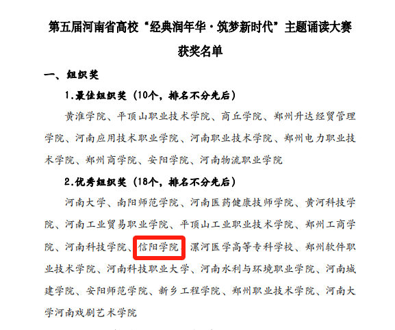 近日,由河南省高校图书情报工作委员会、“学习强国”河南学习平台主办的第五届河南省高校“经典润年华·筑梦新时代”主题诵读大赛活动圆满落幕。在此次大赛中,图书馆积极宣传、师生踊跃参与,取得了较好的成绩。我校荣获“优秀组织奖”称号,王思婕老师获评“优秀组织者”称号;学生组陈添添的作品《月光下的中国》(音频)获得三等奖,咸雅琪的作品《中国-世事两茫茫》(视频)获得三等奖,华梦想、周子怡、代晶源、乔倩雨、张晨娴的作品《你要写河南,就不能只写河南》获得网络人气奖;教师组韩冰的作品《豫水·柔情-信阳 南湾湖》(音频)获得三等奖,王晓涵的作品《自然篇-罗山 灵山》(音频)获得三等奖;