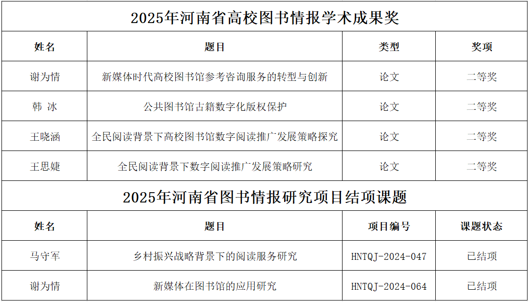 近日,河南省高校图书情报学术成果奖评选结果正式公布,我馆教职工谢为情、韩冰、王晓涵、王思婕获得论文类二等奖,马守军、谢为情课题顺利通过专家评审,完成结项验收。
