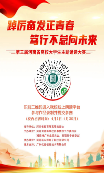 深入挖掘中华优秀传统文化的深厚内涵与人文精神,“滋养民族心灵 ,培育文化自信”,进一步加强“四史”学习,在学习领悟中坚定理想信念,在奋发有为中践行初心使命。在第27个“世界读书日”(4月23日)来临之际,河南省高等学校图书情报工作委员会举办第三届河南省高校大学生“踔厉奋发正青春·笃行不怠向未来”主题诵读大赛。