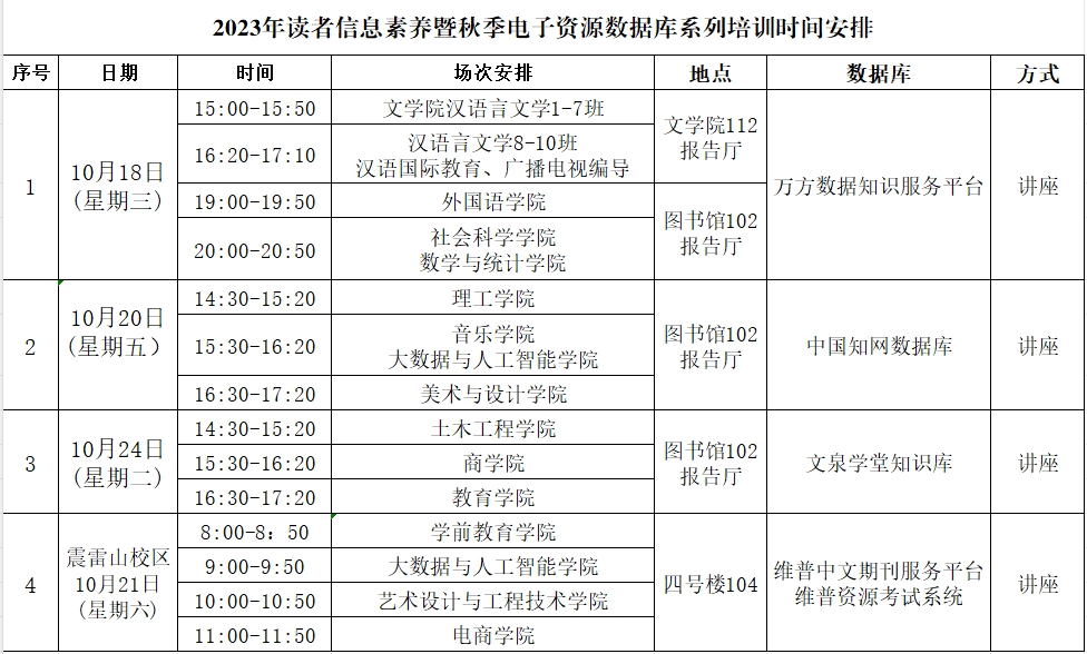 此次培训主要涵盖图书馆常用的数据库,分别为万方数据知识服务平台、中国知网数据库、维普中文期刊服务平台、维普资源考试系统、文泉学堂知识库。具体计划见下表: