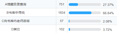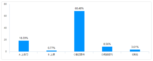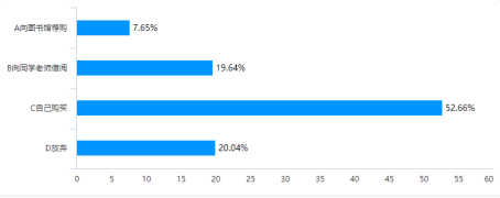 图书馆的图书资料,可以说是海量,但并不是每一本出版的书刊都会采购,总有读者找不到自己想要的书籍。由上图可知,当这种情况出现,52.66%的读者都会选择自己购买,以此来解决自己急需图书的窘境,而仍有20.04%的读者选择放弃图书的查找,不在专注于此本图书的获取。调整馆藏结构、丰富图书藏量,让每一位读者都能找到自己需要的图书,是我馆孜孜不倦追寻的目标。