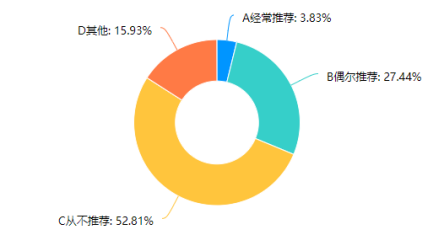 图书馆的图书资源,从某种程度上来说是有限的,当这些有限的图书资源不能满足读者的需求时,图书馆会开辟一些荐购专栏,供读者推荐购买。从调查情况来看,52.81%的读者从不荐购,偶尔推荐的也仅有27.44%。图书馆想要改变目前的现状,必须在荐购上下真功夫,提升学生购买图书的参与度。