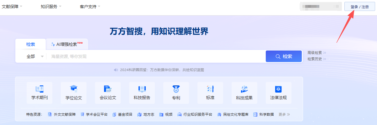 二、进入“万方数据知识服务平台”首页,如图,点击右上角登录
